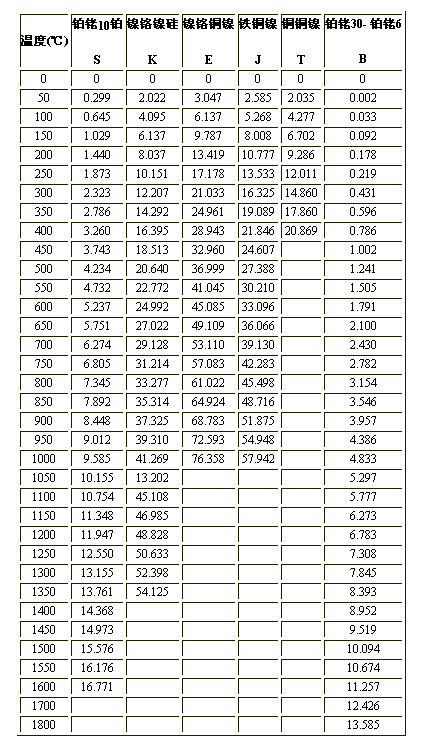 温度(℃) 铂铑10铂 镍铬镍硅 镍铬铜镍 铁铜镍 铜铜镍 铂铑30- 铂铑6